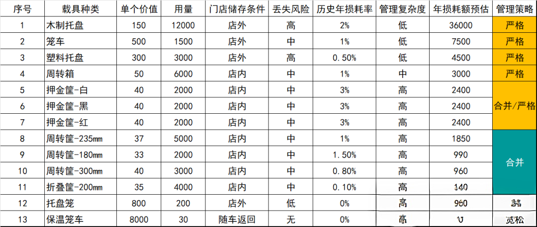 2.分类统计每个载具的损耗率,有些载具,不管控也不会丢失(例如大型瓜果的周转笼)